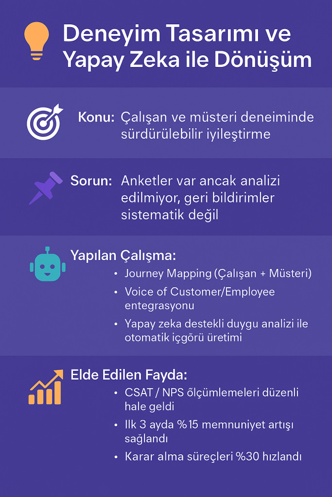 Çalışan ve müşteri deneyimini uçtan uca ele alarak temas noktalarında iyileştirmeler yapılır, bağlılık ve memnuniyet artırılır.